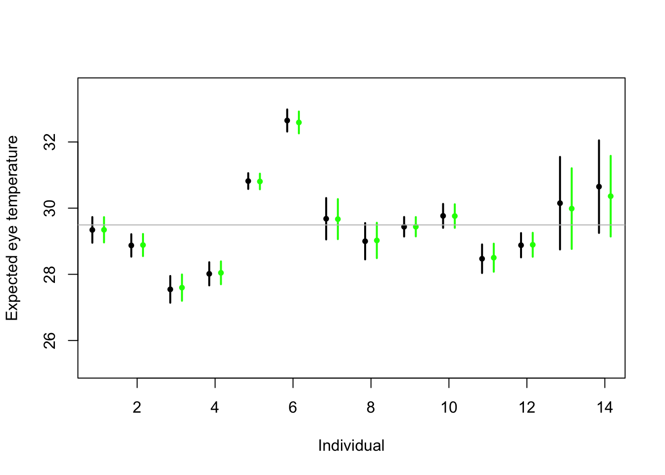 # Random effects regression model (using nlme package; difficult to get confidence interval) library(nlme) m2 <- lme(fixed = eyetemp ~ 1,random= list(id = pdIdent(~id-1)),data=df.et,method="ML")#summary(m2) #predict(m2,level=1,newdata=data.frame(id=unique(df.et$id))) # Random effects regression model (mgcv package) library(mgcv) m2 <- gam(eyetemp ~ 1+s(id,bs="re"),data=df.et,method="ML") plot(df.et$id.num,df.et$eyetemp,xlab="Individual",ylab="Expected eye temperature",col="white") points(1:14-0.15,coef(m1),pch=20,col="black",cex=1) segments (1:14-0.15,confint(m1)[,1],1:14-0.15,confint(m1)[,2] ,lwd=2,lty=1) pred <- predict(m2,newdata=data.frame(id=unique(df.et$id)),se.fit=TRUE) pred$lci <- pred$fit - 1.96*pred$se.fit pred$uci <- pred$fit + 1.96*pred$se.fit points(1:14+0.15,pred$fit,pch=20,col="green",cex=1) segments (1:14+0.15,pred$lci,1:14+0.15,pred$uci,lwd=2,lty=1,col="green") abline(a=coef(m2)[1],b=0,col="grey")