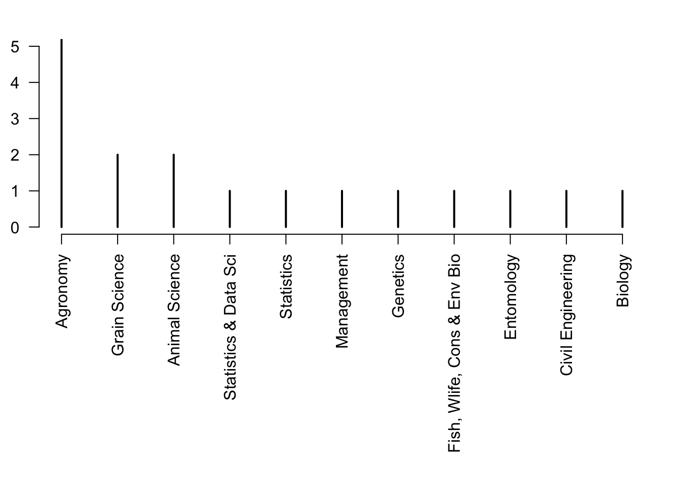 plot(rev(sort(table(df$degreeProgram))),las=2,xlab="",ylab="Number of students",ylim=c(0,5))