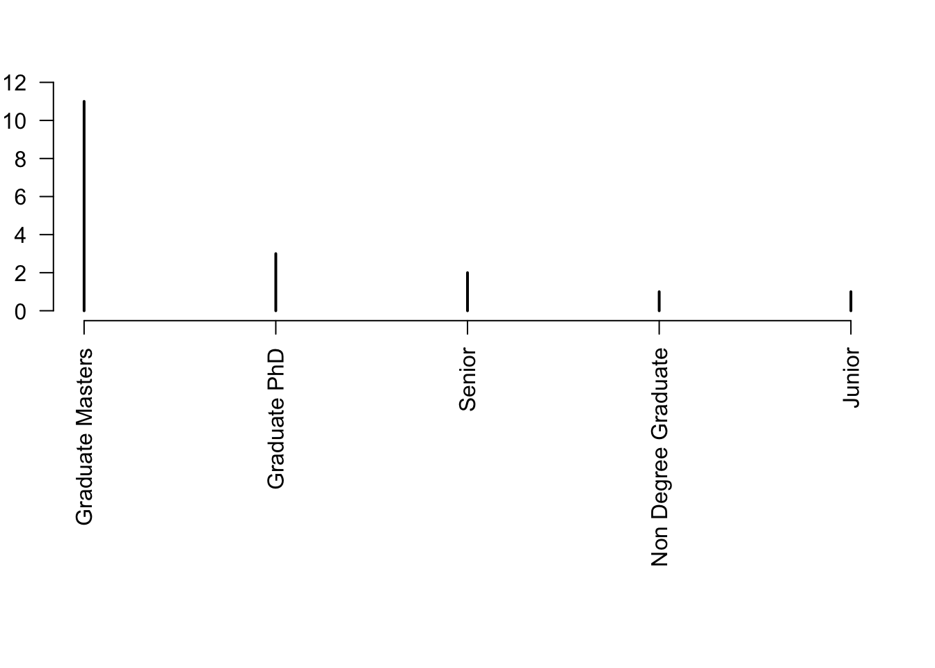 plot(rev(sort(table(df$classLevel))),las=2,xlab="",ylab="Number of students",ylim=c(0,13))