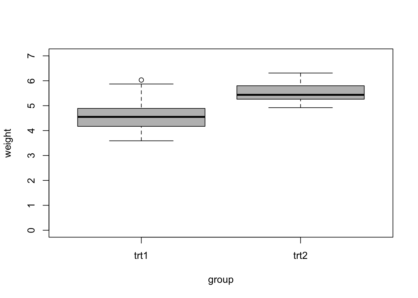 library(faraway) df.plant <- PlantGrowth[-c(1:10),] df.plant$group <- factor(df.plant$group) boxplot(weight ~ group,df.plant,col="grey",ylim=c(0,7))