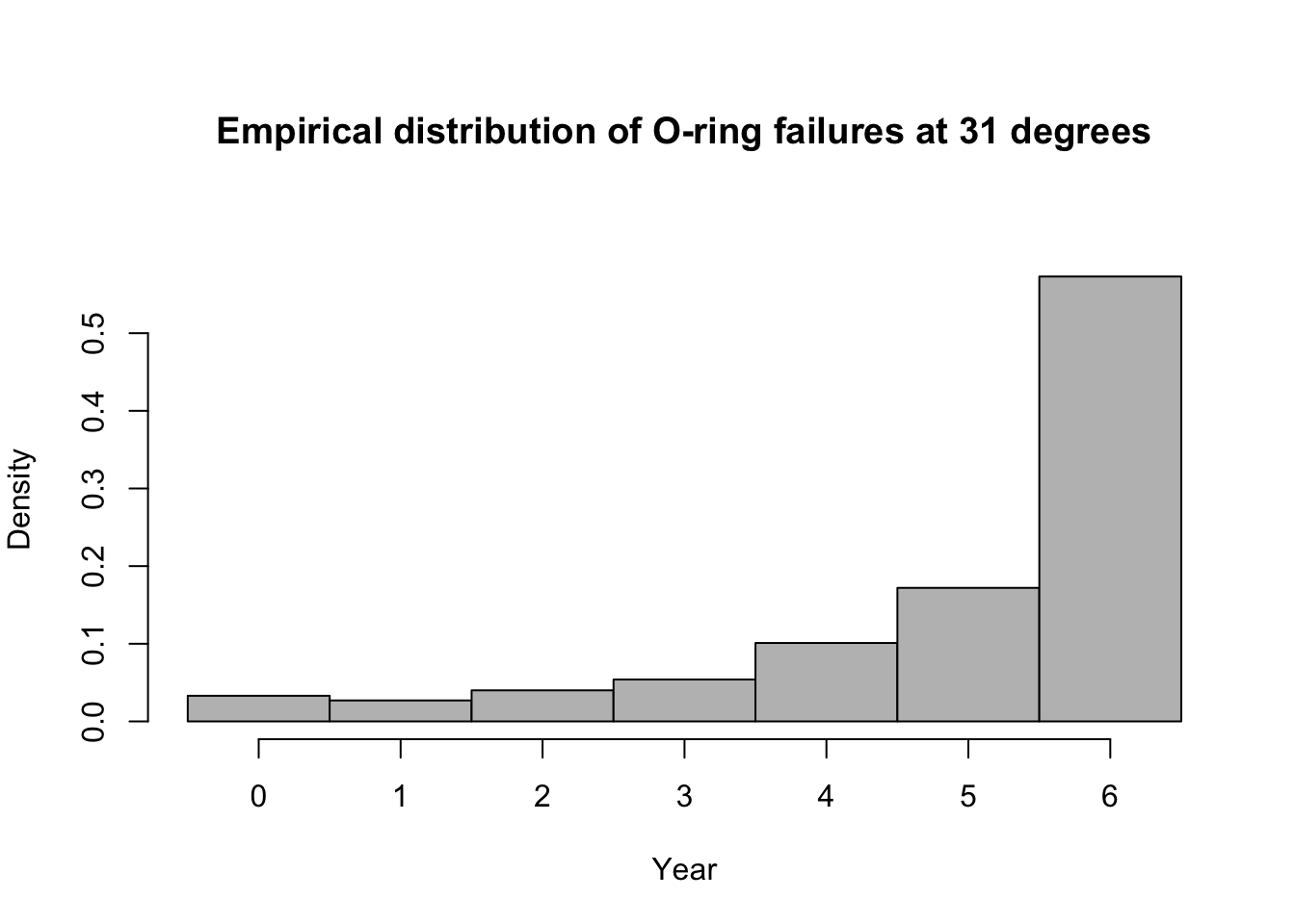 library(mosaic) predict.bs <- function(){ m1 <- glm(cbind(O.ring,6-O.ring) ~ Temp, family = binomial(link = "logit"),data=resample(challenger)) p <- predict(m1,newdata=data.frame(Temp=31),type="response") y <- rbinom(1,6,p) y } bootstrap <- do(1000)*predict.bs() par(mar = c(5, 4, 7, 2)) hist(bootstrap[,1], col = "grey", xlab = "Year", main = "Empirical distribution of O-ring failures at 31 degrees", freq = FALSE,right=FALSE,breaks=c(-0.5:6.5))