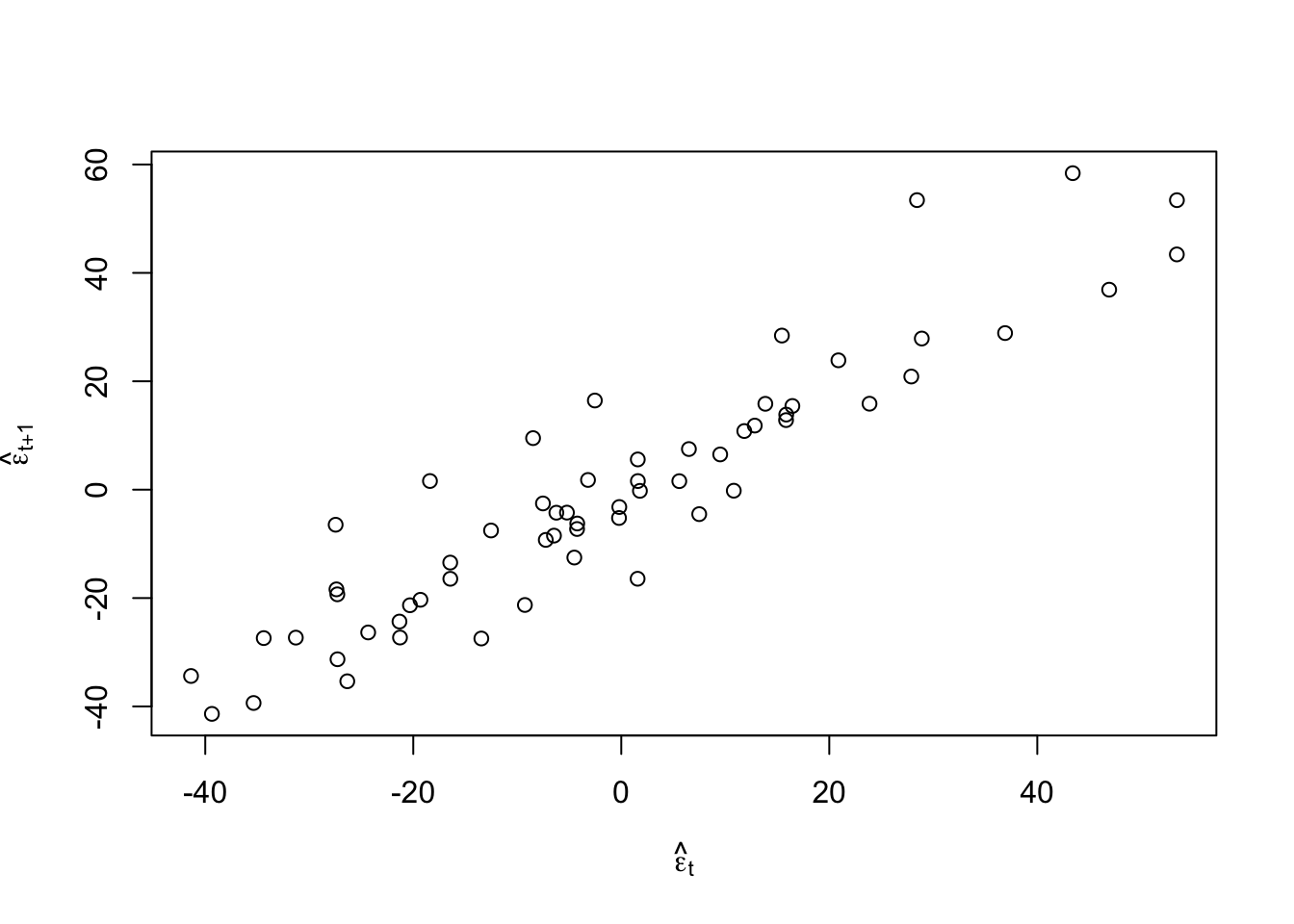 #Check for autocorrelation among residuals plot(e.hat[1:60],e.hat[2:61],xlab=expression(hat(epsilon)[t]),ylab=expression(hat(epsilon)[t+1]))