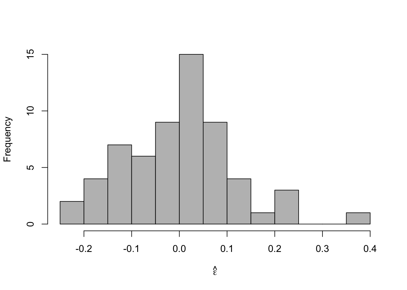- Check model assumptionse.hat <- residuals(m2) #Check normality hist(e.hat,col="grey",breaks=10,main="",xlab=expression(hat(epsilon)))