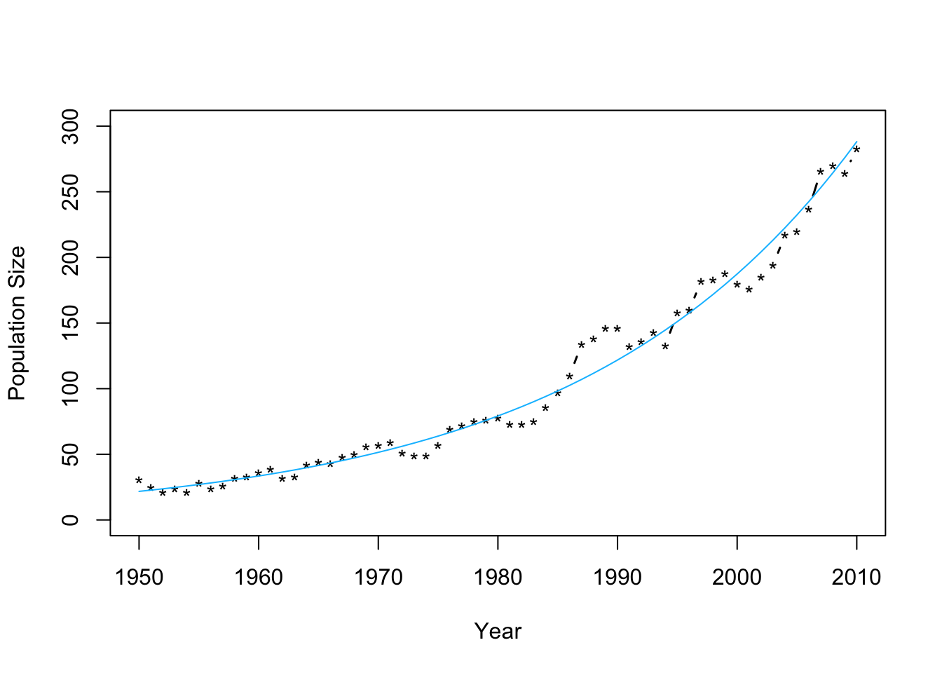 - Confidence intervals and prediction intervalsplot(df1$Winter,df1$N,typ="b",xlab="Year",ylab="Population Size",ylim=c(0,300),lwd=1.5,pch="*") ev.y.hat <- exp(predict(m2)) # Possible because of invariance property of MLEs points(df1$Winter,ev.y.hat,typ="l",col="deepskyblue")