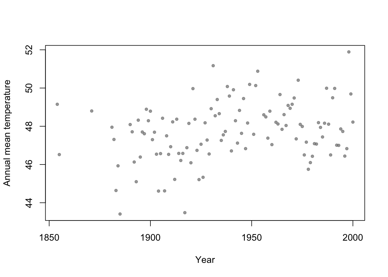 plot(aatemp$year,aatemp$temp,xlab="Year",ylab="Annual mean temperature",pch=20,col=rgb(0.5,0.5,0.5,0.7))