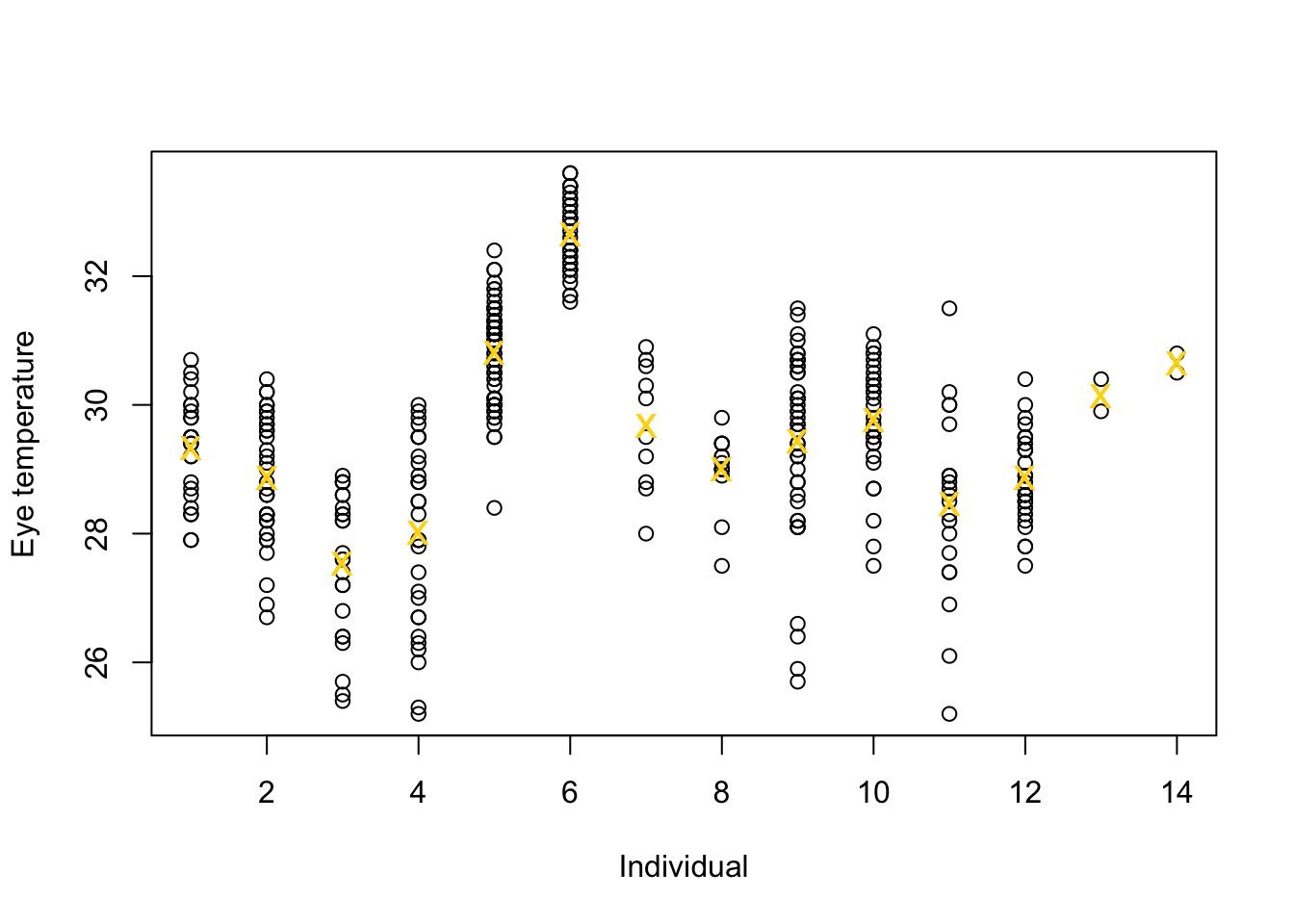 df.et <- read.table("https://www.dropbox.com/s/bo11n66cezdnbia/eyetemp.txt?dl=1") names(df.et) <- c("id","sex","date","time","event","airtemp","relhum","sun","bodycond","eyetemp") df.et$id <- as.factor(df.et$id) df.et$id.num <- as.numeric(df.et$id) ind.means <- aggregate(eyetemp ~ id.num,df.et, FUN=base::mean) plot(df.et$id.num,df.et$eyetemp,xlab="Individual",ylab="Eye temperature") points(ind.means,pch="x",col="gold",cex=1.5)