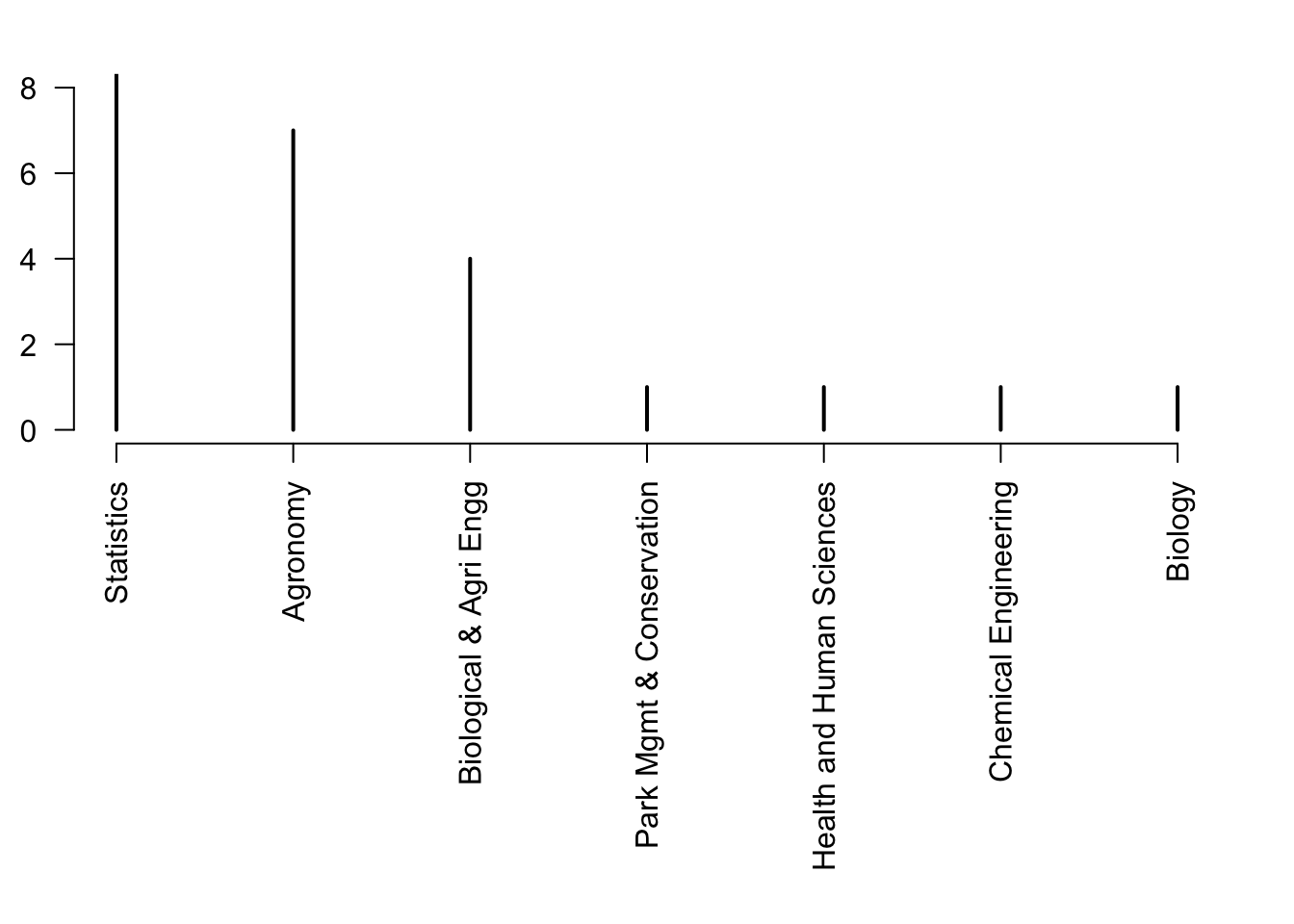 plot(rev(sort(table(df$degreeProgram))),las=2,xlab="",ylab="Number of students",ylim=c(0,8))