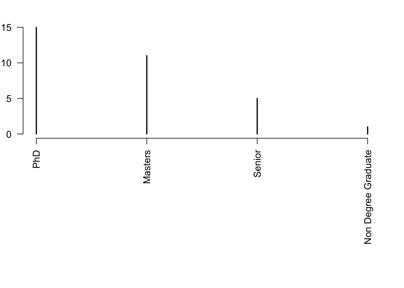 plot(rev(sort(table(df$classLevel))),las=2,xlab="",ylab="Number of students",ylim=c(0,15))