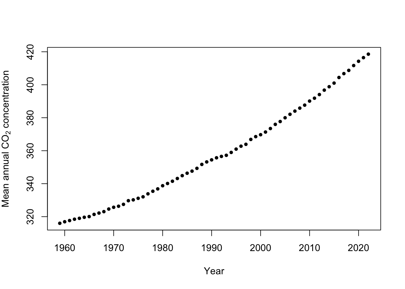 url <- "ftp://aftp.cmdl.noaa.gov/products/trends/co2/co2_annmean_mlo.txt" df <- read.table(url,header=FALSE) colnames(df) <- c("year","meanCO2","unc") plot(x = df$year, y = df$meanCO2, xlab = "Year", ylab = expression("Mean annual "*CO[2]*" concentration"),col="black",pch=20)