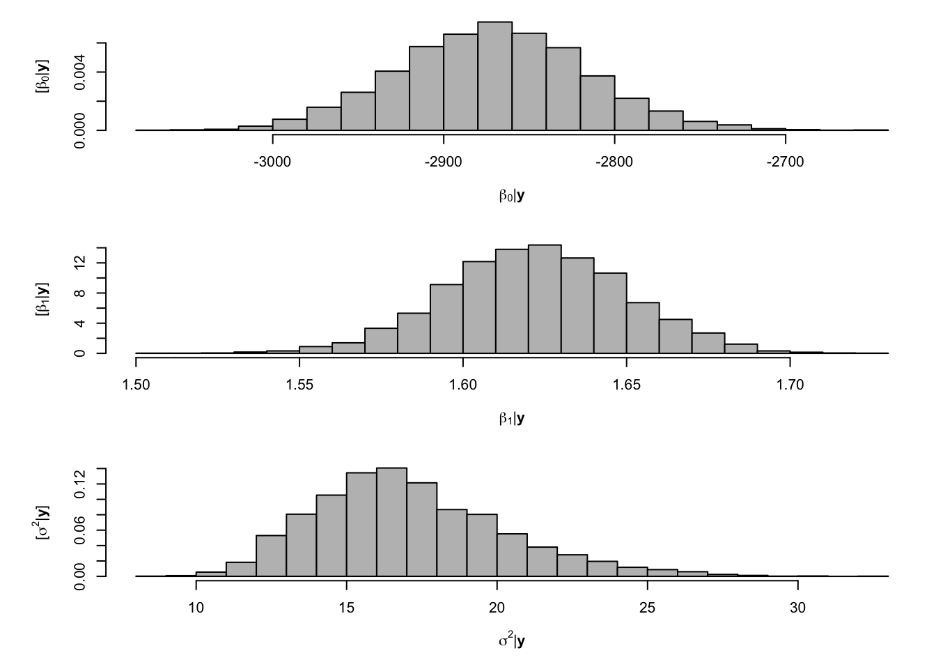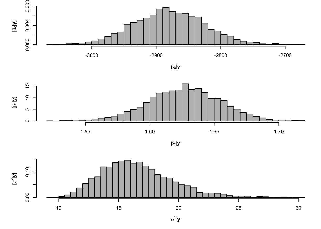 library(MCMCpack) samples <- MCMCregress(y ~ X - 1, burnin = 0,mcmc = 5000 , b0 = 0,B0 = 1/sigma2.beta, c0 = q, d0 = 1/r) burn.in <- 1000 samples <- samples[burn.in:5000,] # Extract samples from the posterior for beta and sigma2 from MCMCregress output # Look a histograms of posterior distributions par(mfrow=c(3,1),mar=c(5,6,1,1)) hist(samples[,1],xlab=expression(beta[0]*"|"*bold(y)),ylab=expression("["*beta[0]*"|"*bold(y)*"]"),freq=FALSE,col="grey",main="",breaks=30) hist(samples[,2],xlab=expression(beta[1]*"|"*bold(y)),ylab=expression("["*beta[1]*"|"*bold(y)*"]"),freq=FALSE,col="grey",main="",breaks=30) hist(samples[,3],xlab=expression(sigma^2*"|"*bold(y)),ylab=expression("["*sigma^2*"|"*bold(y)*"]"),freq=FALSE,col="grey",main="",breaks=30)