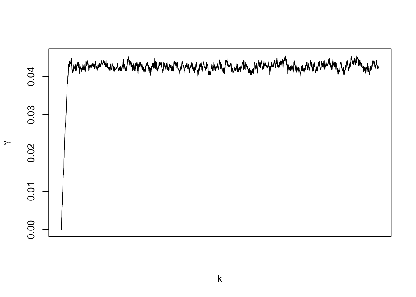 plot(samples[,1],typ="l",xlab="k",ylab=expression(gamma),xaxt='n')