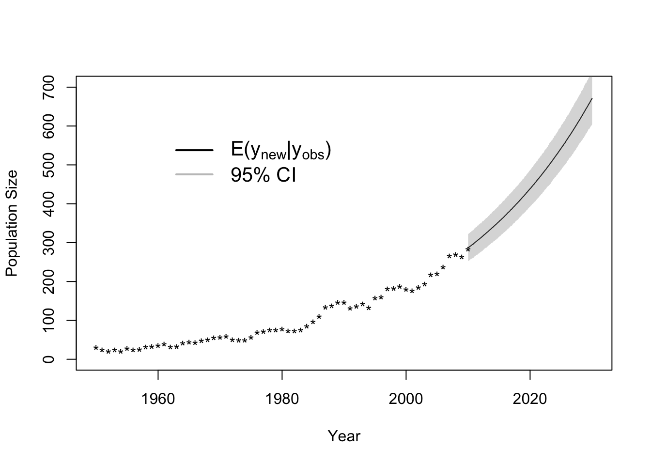 legend(x = 1960, y = 600, cex = 1.3, legend = c(expression("E("*y[new]*"|"*y[obs]*")"),"95% CI"), bty = "n",