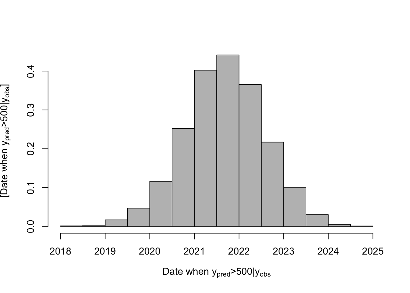 hist(date.deriv,col="grey",freq=FALSE,main="",xlab=expression("Date when "* y[pred] *">500|"*y[obs]),