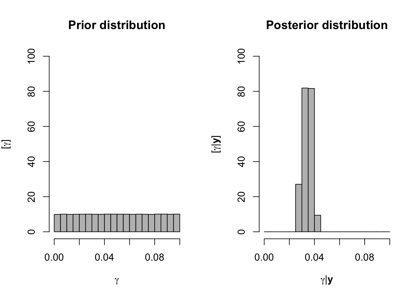 K <- 10^6 # Number of samples to try samples <- matrix(,K,2) # Save samples lambda0 <- df1$N[1] # Lambda0 y <- df1$N[-1] # Data t <- df1$Winter[-1] - 1950 # Time for(i in 1:K){ gamma <- runif(1,0,0.1) lambda <- lambda0*exp(gamma*t) y.sample <- rpois(length(t),lambda) samples[i,1] <- mean(abs(y-y.sample)) samples[i,2] <- gamma } par(mfrow=c(1,2)) hist(samples[,2],col="grey", main="Prior distribution",xlab=expression(gamma),ylab=expression("["*gamma*"]"),ylim=c(0,100),freq=FALSE,breaks=seq(0,0.1,by=0.005)) hist(samples[which(samples[,1]<30),2],ylim=c(0,100),xlim=range(samples[,2]),col="grey", main="Posterior distribution",xlab=expression(gamma*"|"*bold(y)),ylab=expression("["*gamma*"|"*bold(y)*"]"),freq=FALSE,breaks=seq(0,0.1,by=0.005))