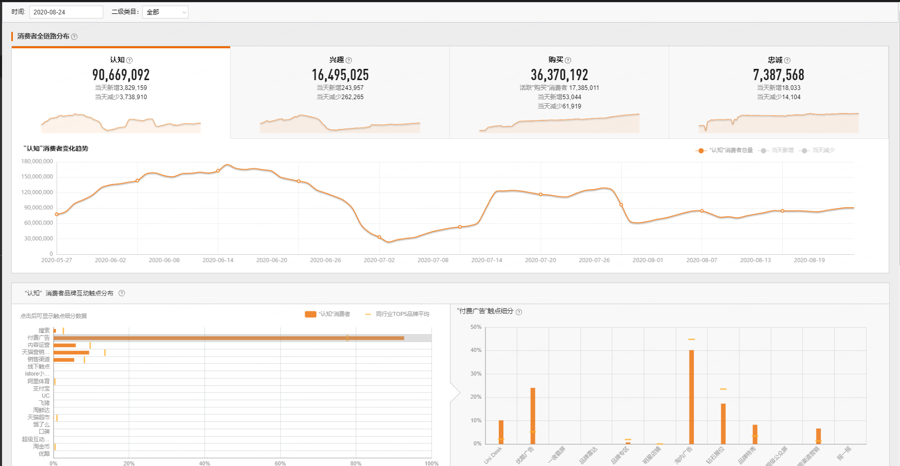 - 注意: 品牌属性的触点只会归属品牌AIPL,不会归属二级类目AIPL,例如,以下触点(付费广告,品牌号,超级品牌日,欢聚日,直播,淘宝头条,微淘,天合计划,线下门店,快闪店,智能母婴室)的消费者仅归属品牌AIPL,不会归属二级类目AIPL。"