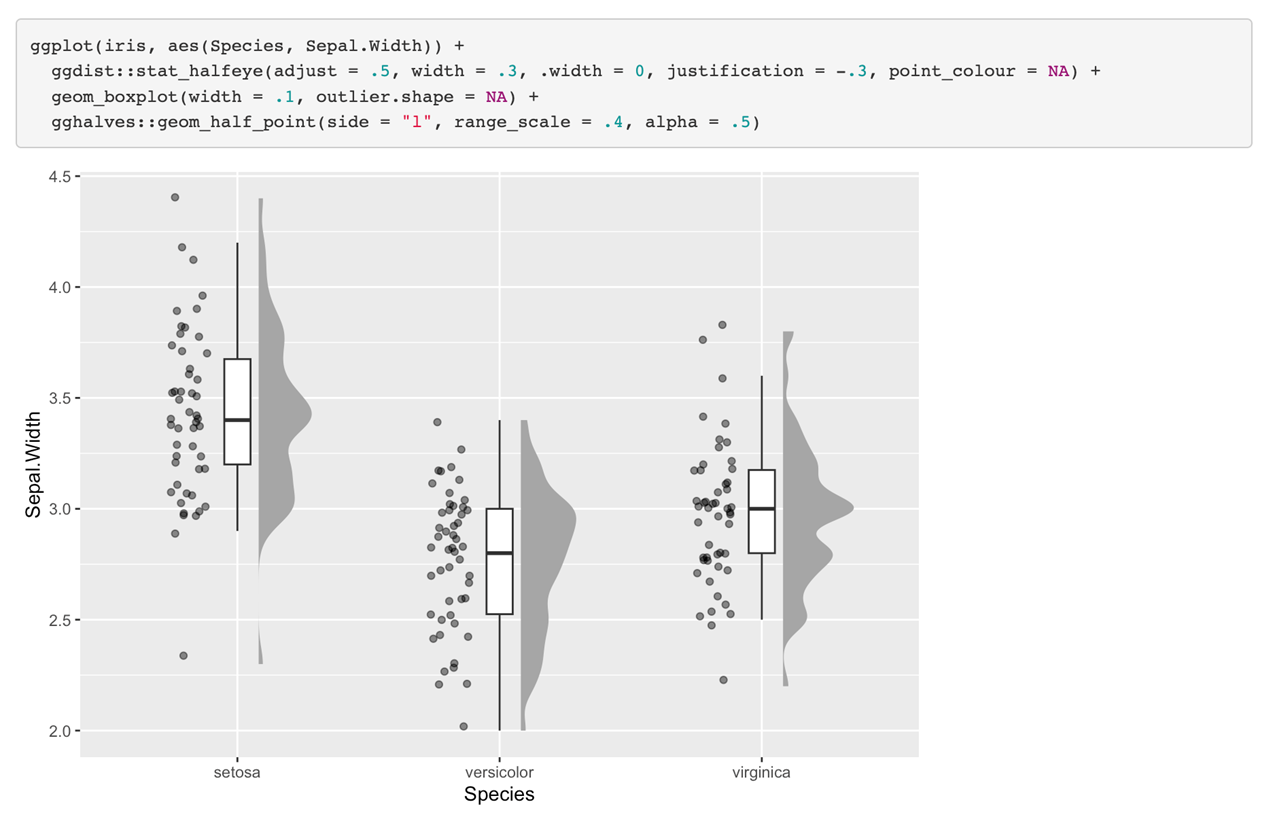 最近几年非常流行的雨云图。当然我们还可以把多个(图)进行叠加,像这种被试类的实验设计我们可以把每个点都连到一起,可以看到在不同之间的一个变化,它是不是完全具有一致性的。然后我们把把这个box plot也加上去,这样的话我们能够看到极端点。我们同时还把这个分布加上去,当然这个分布目前的α值比较高,我们还可以把它调的低一点,就是说让他透明度再低一点,让我们看到这个分布之间的一个叠加。这样我们就可以在一个图上看到非常丰富的信息。