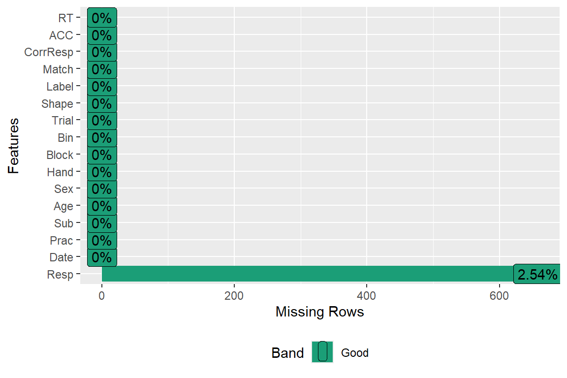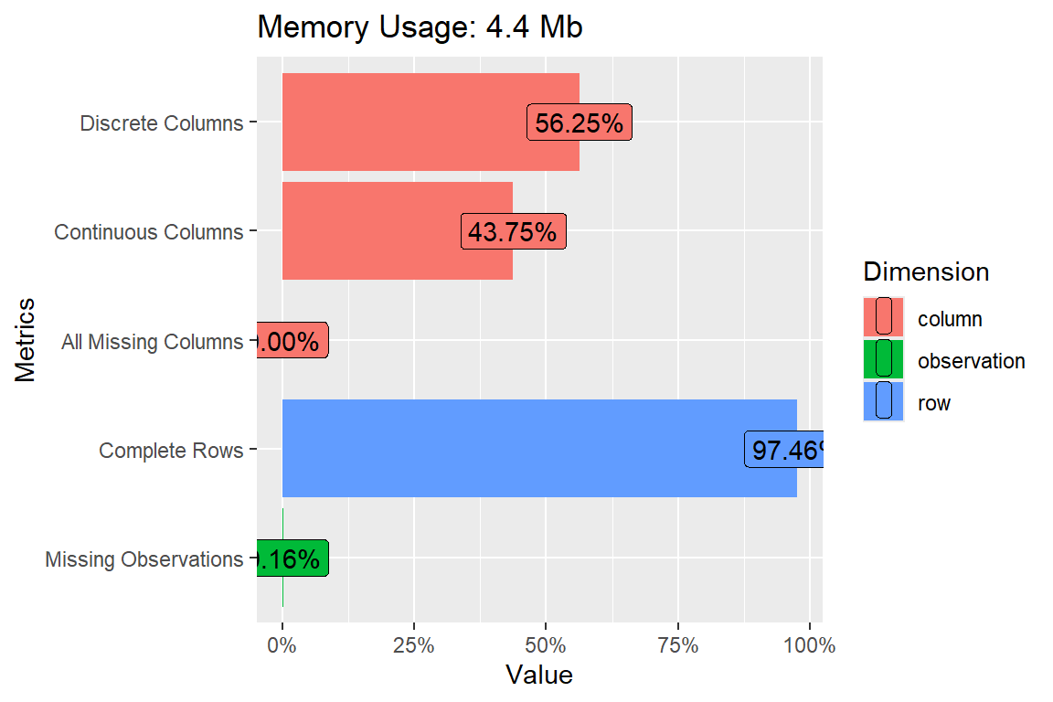 据探索包的一个独特特点,它可以帮助我们快速可视化数据。关于缺失值,我们可以使用plot_missing命令将具有缺失值的列可视化。大多数列都没有缺失值,只有一个响应列有2.5%的缺失值。