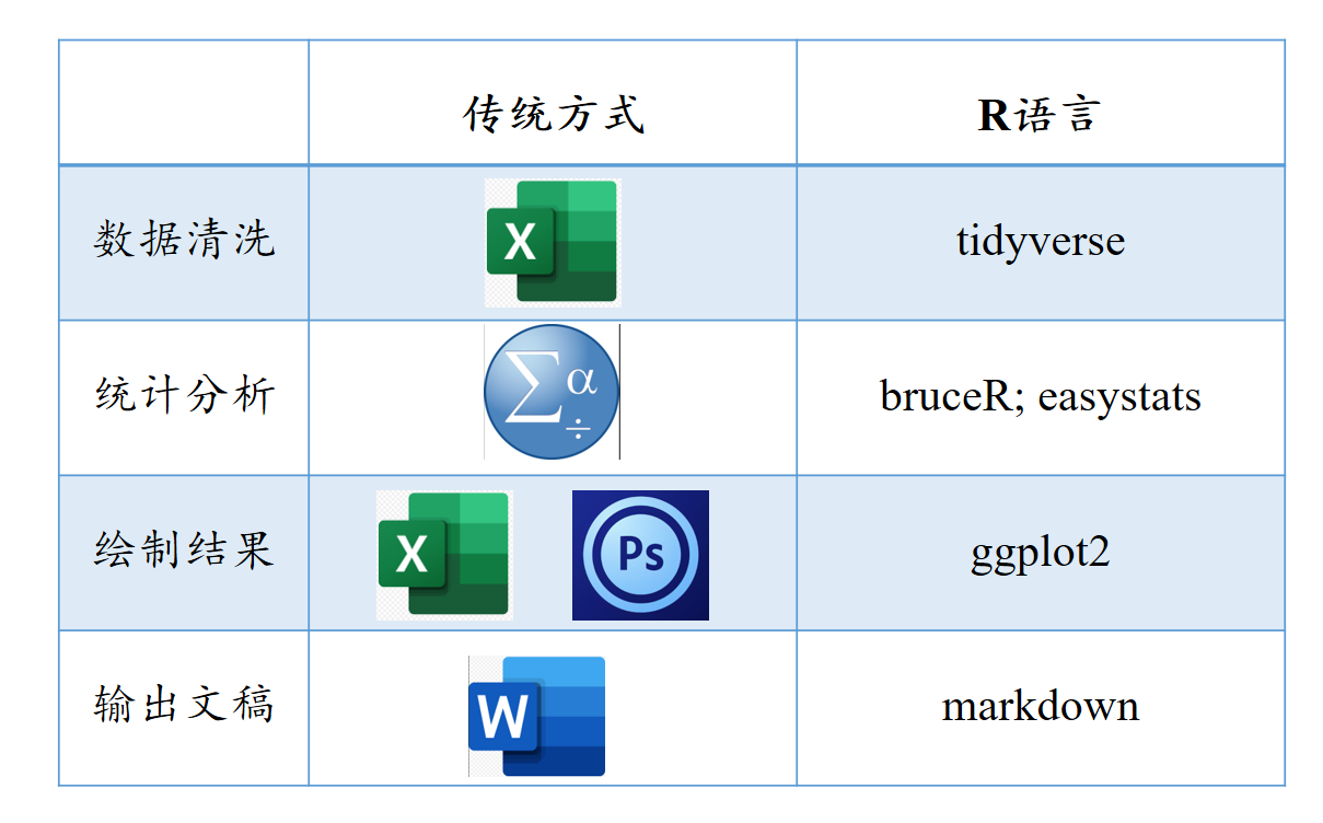 我们把R和传统的方式比较一下:在我读硕士和博士的早期,基本上都是采用传统的方式,首先在Excel中手动清理数据,筛选并删除不需要的行,然后保存为新的文件。然后,我们在SPSS中进行分析,绘制结果时基本上是Excel加上Photoshop,或者使用Illustrator等软件。在心理学中,主要使用的可能还是Excel,我当年用excel画error bar(误差线)还挺熟的。在excel中绘制的误差线比在SPSS中更好看。有时候需要对图形进行拼接时,可能需要借助Photoshop。这是我们以前的工具套装。最后,我们在Word中撰写报告。