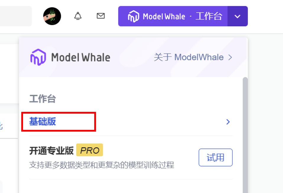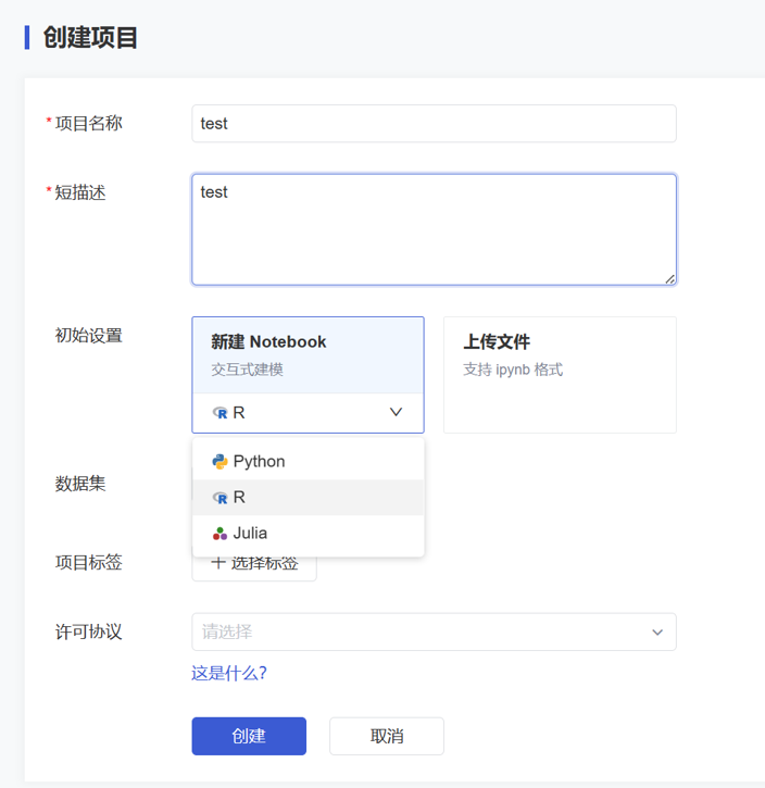 假如你已经注册一个和鲸的用户账户。注册并登录后,进入社区界面,在右上角会看到一个工作台的下拉菜单。点击这个三角形的下拉标志,选择基础版工作台。进入工作台后,你会看到一个界面,其中有一个加号按钮,用于新建项目。点击这个加号就可以建立一个新项目。比如,建一个名为 “test”的项目。