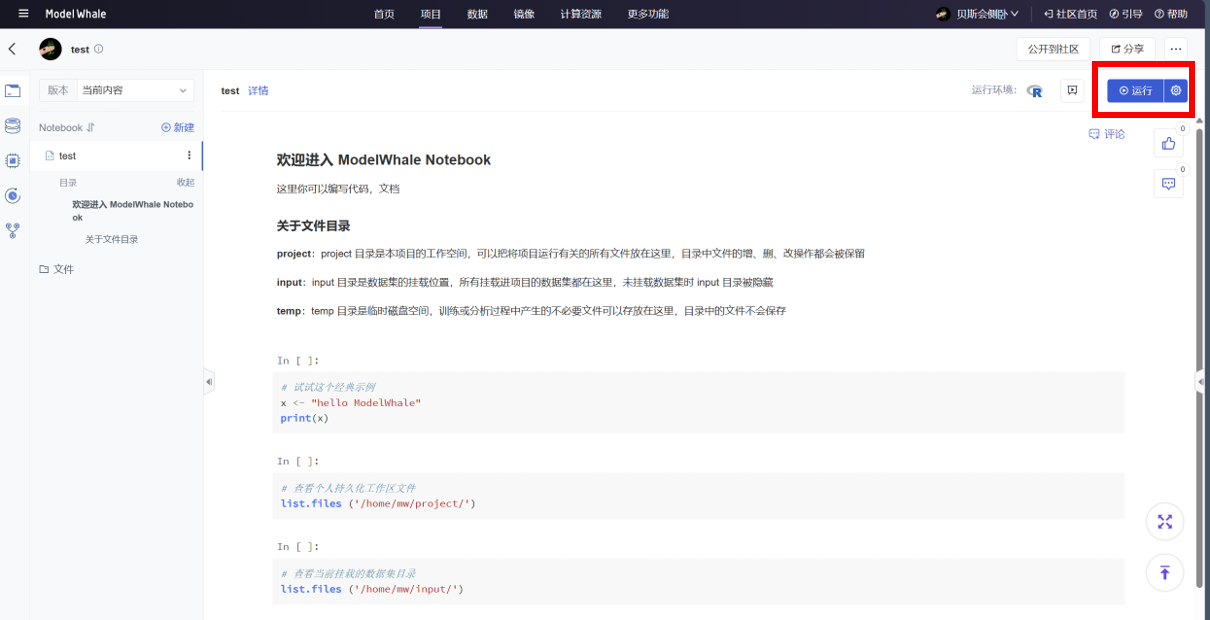 它实际上提供了一个 Notebook,在notebook里面,文字和代码可以混合编写。这里有一个“欢迎进入ModelWhale Notebook”的标题,双击标题符号可以编辑内容。如果发现无法编辑,可能是因为还没有运行项目的镜像。需要点击运行按钮来启动项目。在运行前,你可以点击齿轮图标进行设置,比如选择计算资源和时间。选择好后点击运行,那么它就开始给你打开一个云端的服务器,它需要一点的等待时间。当它可以用的时候,它上面会显示一个R、空心的圆,表示你可以用这个计算机资源了,计算机语言是R语言。