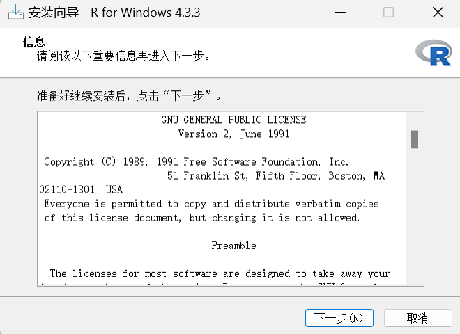 一般来说,现在大部分计算机都是64位比特的CPU,所以安装64位的R就足够了。安装时全部采用默认选择,安装完成后,你就可以看到下面这个界面。我的电脑上也没有安装R,所以我会直接给大家演示一遍R的安装过程。这是一个比较老的Windows机器,我习惯将其设置为英文界面,因为有时候如果设置为中文,可能会出现一些问题。现在,我将演示安装R的过程。首先,我会直接选择安装路径,确保路径中没有中文名称。然后,安装过程很快,完成后,我们会看到R的Logo,点击它就可以打开R的界面。