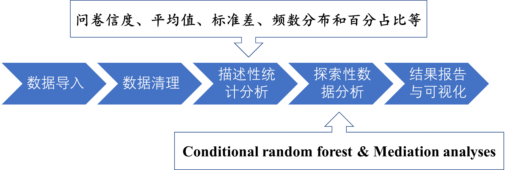 那么当我们拿到这个数据之后,我们可能还要经过一系列的预处理,我们要把它导入到R中进行清洗,把它变成干净的数据。当我们在做问卷的时候,通常拿到的分数实际上是对应于问卷条目上的一个得分。为了得到一个变量,或者说被试在某种心理变量上的得分,我们通常需要将这些得分转换成问卷得分,而问卷得分的计算方式可能有多种,最简单的方法就是计算总分或者平均分。我们是否能够在R中实现所有这些工作,如果可以的话,那就意味着我们可以在R中完成我们的所有分析工作。