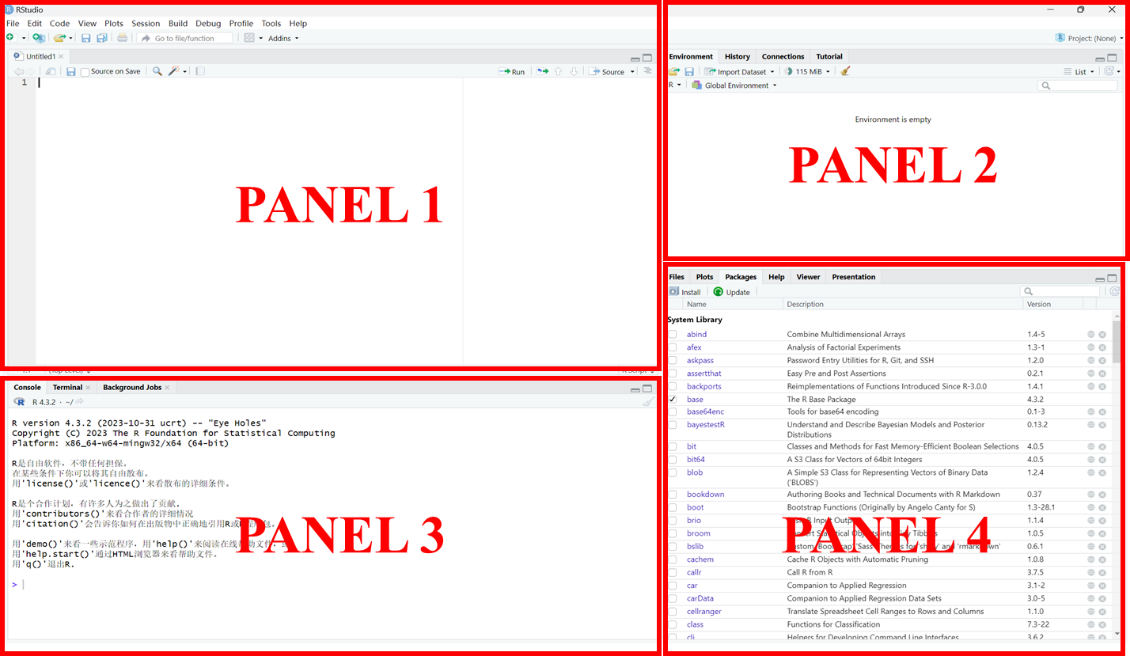 1. 左上角(panel 1):这是代码编辑区域,也被称为面板一,实际上它是一个文本编辑器,我们可以在这里编写R代码。