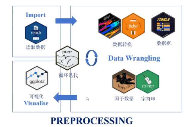 首先,Tidyverse是一个生态系统,它基本上就是帮助我们进行数据处理的。在上节课,我们学习了如何导入数据,Tidyverse中也有一个包,专门用于读取数据。当你将数据读取到R中后,接下来就需要进行一系列操作,包括数据的转换、选择,然后将其整理成一个较为干净的数据框。此外,还包括对数据的整理和串行的操作等。Tidyverse中的各个包都是为了适应各种各样的预处理需求。