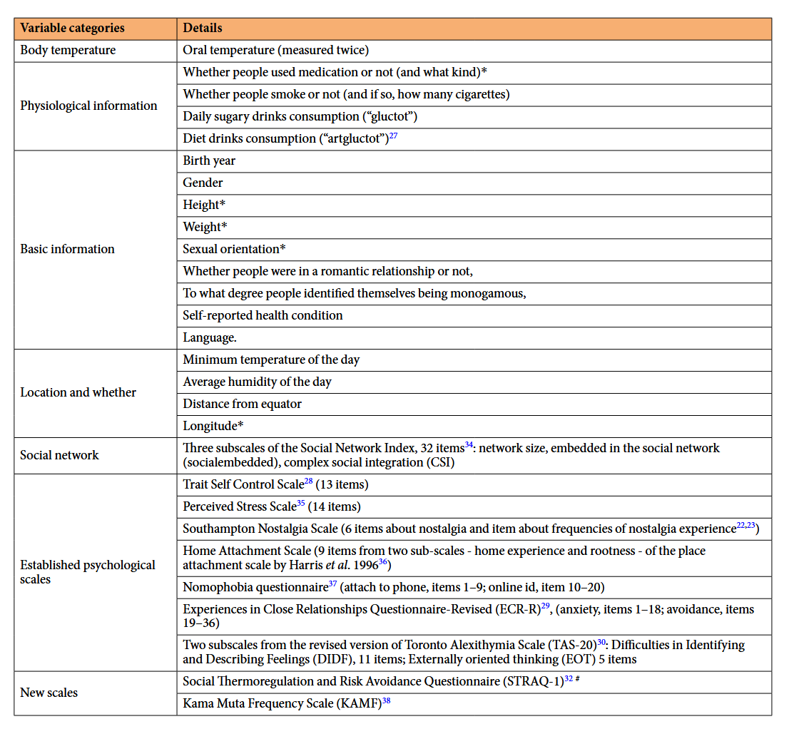 在这个数据库中,我们实际上有很多数据,包括身体温度,这个是通过测量口腔温度来进行的,还有一些生理条件信息,比如用药情况等,以及基本信息,如人口学信息,包括出生年份、性别、性取向等。有些变量可能需要向数据拥有者那样申请ID后才能使用,有些则是完全开放的。我们使用的是完全开放的数据,包括当地的地址和信息、社交网络信息,以及一些常见的心理学变量。