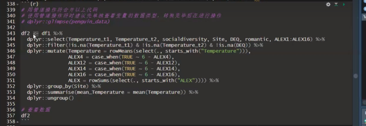 如果我们使用管道操作的话,它就是直接以这个data作为输入,经过filter之后,然后再经过arrange排序之后,它会返回到这个filtered_sorted_data。这样的话,我们就省掉了一些中间的步骤。如果你的中间步骤非常长的话,那你省掉的中间变量就非常多。这样的话,你的代码就不会占用过多的内存,也会很整洁。