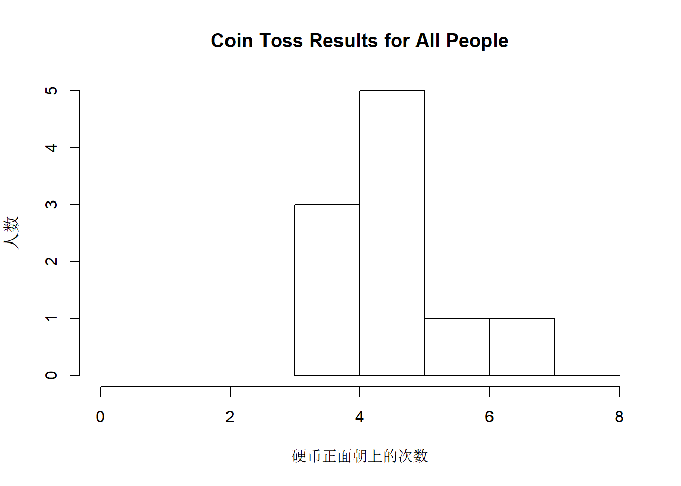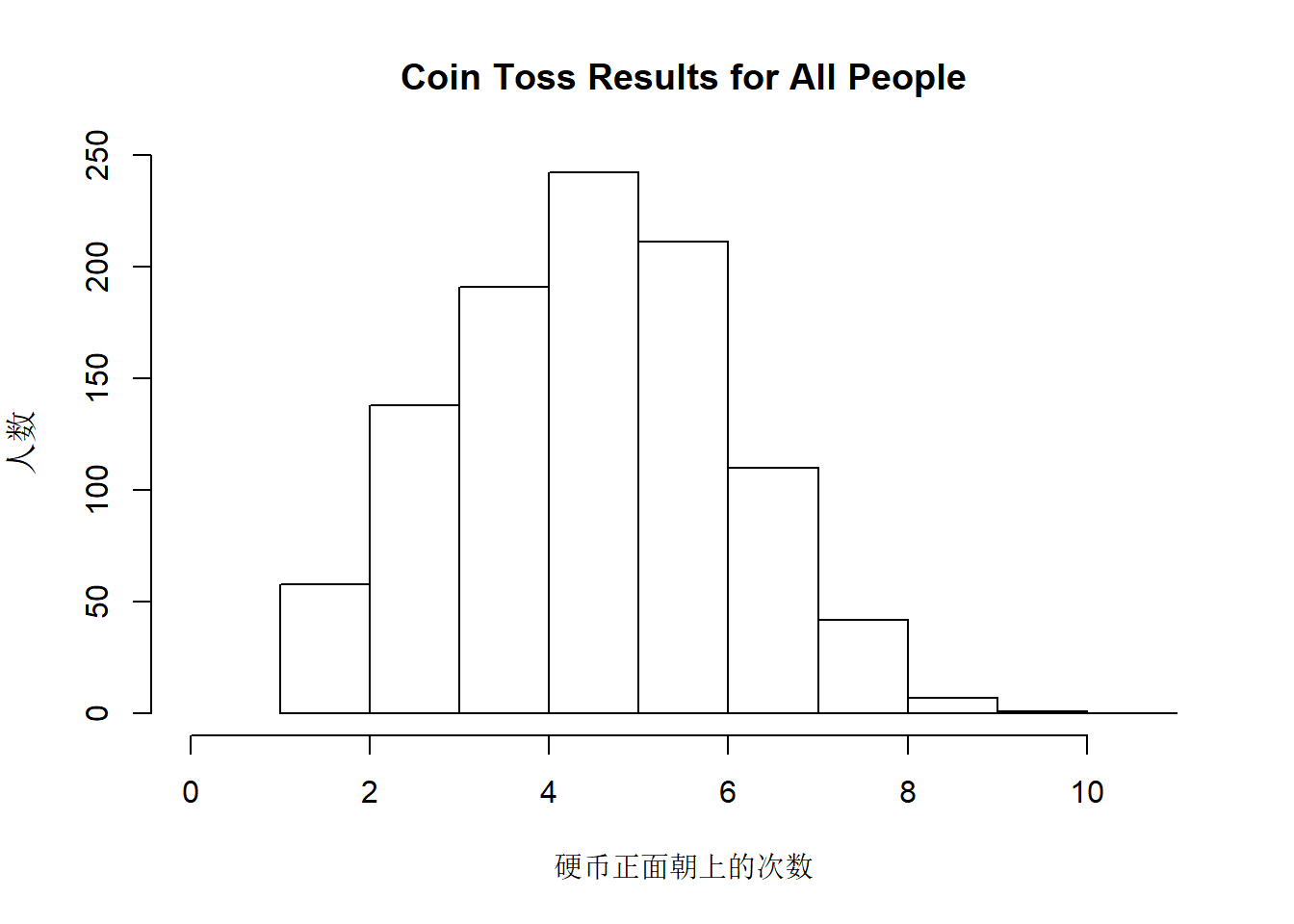 我们让若干人每人抛若干次硬币,首先让5个人每人抛10次硬币。理论上来说,对于一枚公平的硬币,正面朝上次数为5的应该是最多的。