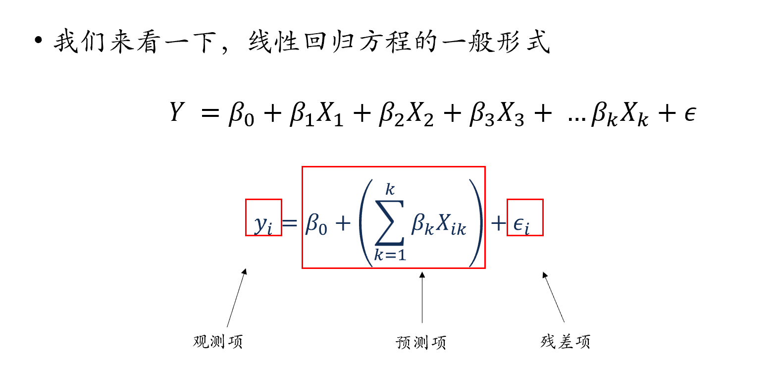- 回归模型形式:观测项 = 预测项 + 误差项