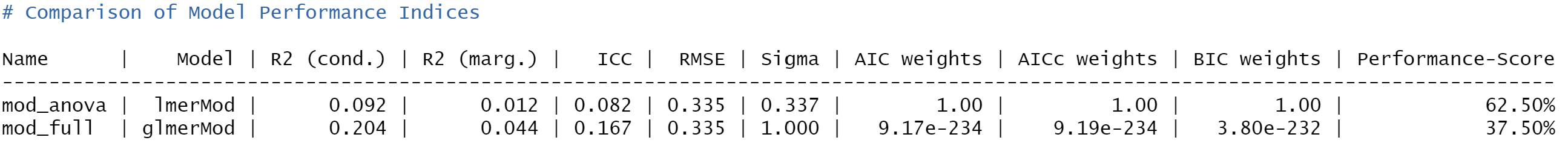 performance()结果会把比较好的模型排在上面,总体而言anova模型更好。不过我们可以看到一些参数,R2表示模型解释的变异,ICC反映的是个体变异的内容,这两个参数都是层级模型更优。我们再用anova()对模型做一次比较。