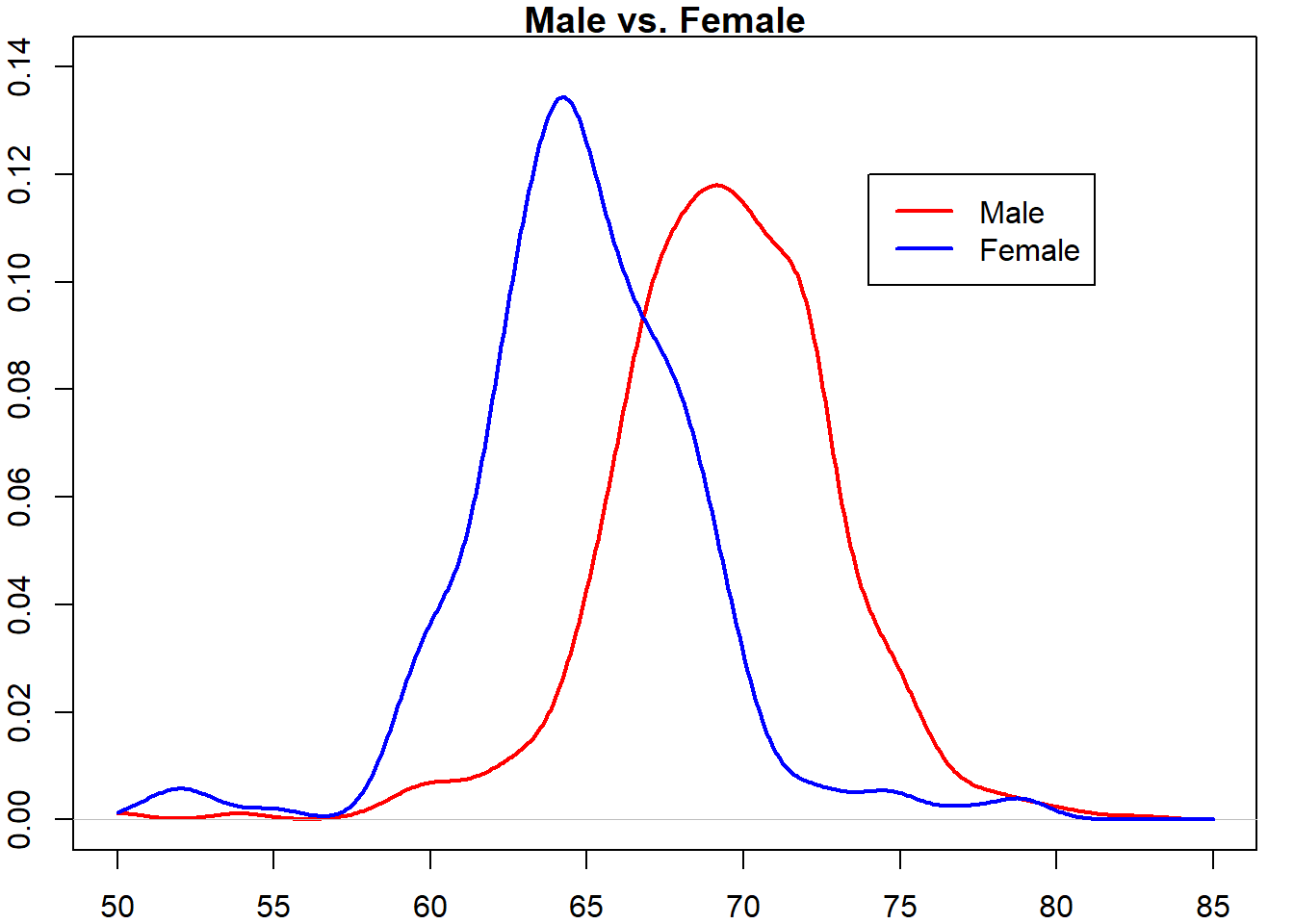 例 2.25 R软件包dslabs收集了男生和女生的身高数据(单位英寸),由此估计男女身高总体的密度函数。