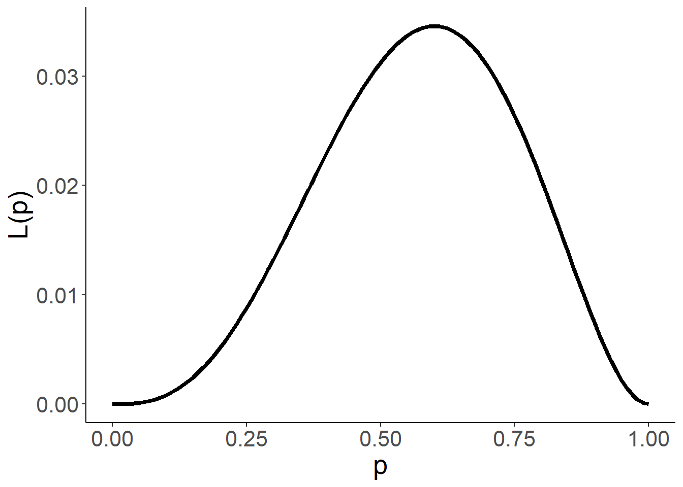 \[L(p)=p^3(1-p)^2,\ p\in (0,1).\]图像如下
