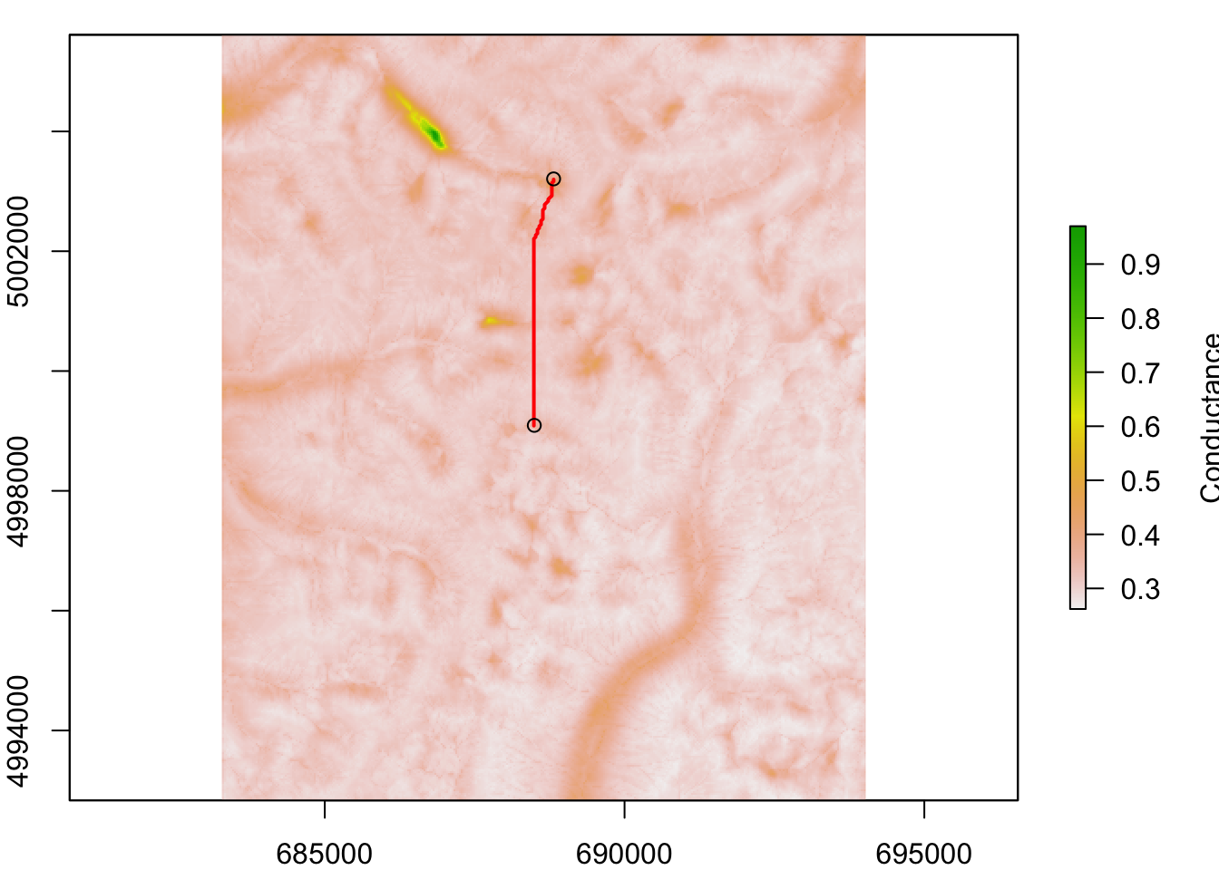 The higher the conductance, the lower the cost or resistance of a cell, and vice versa. We want to integrate conductance across cells to derive some measure of effective (or ecological) distance.