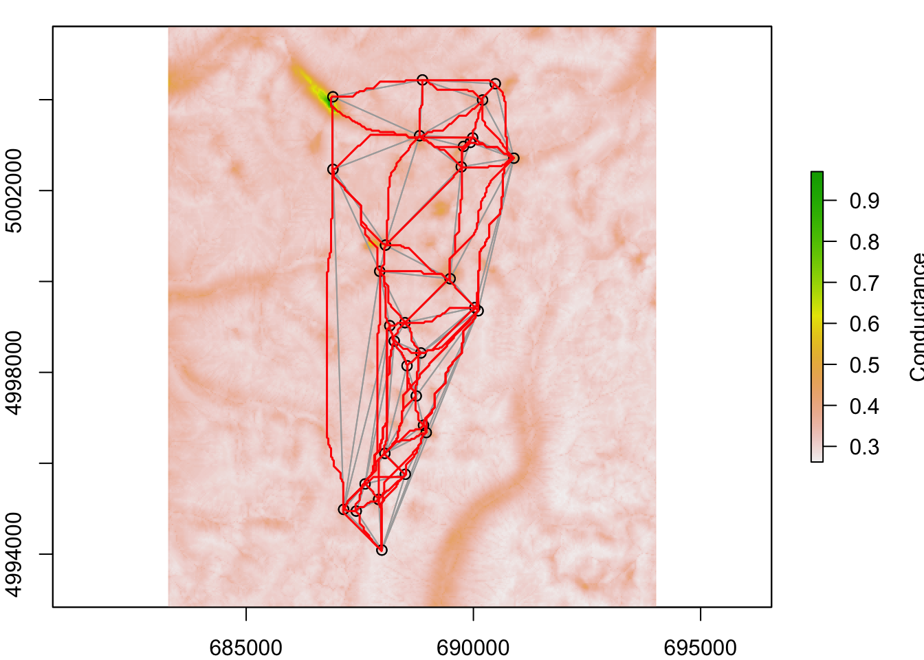 - Plot site locations on top of conductance raster