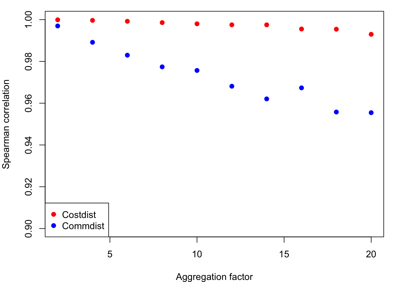 ylim = c(0.9,1), xlab = "Aggregation factor", ylab = "Spearman correlation")