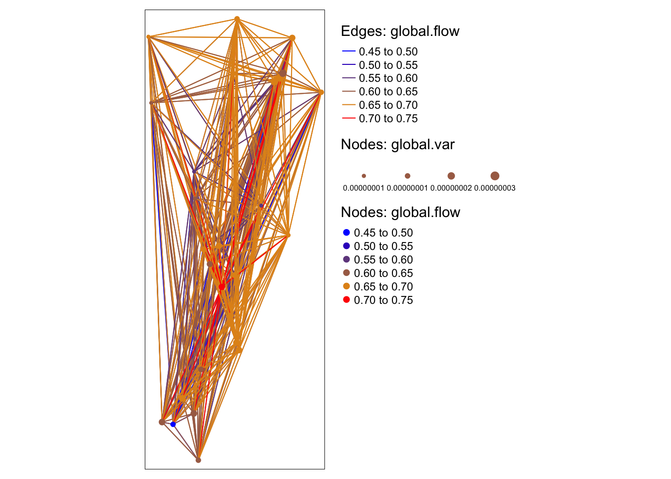 title.col="Nodes: global.flow", title.size="Nodes: global.var") Plot static map: here we tell R to plot the legend outside of the map.