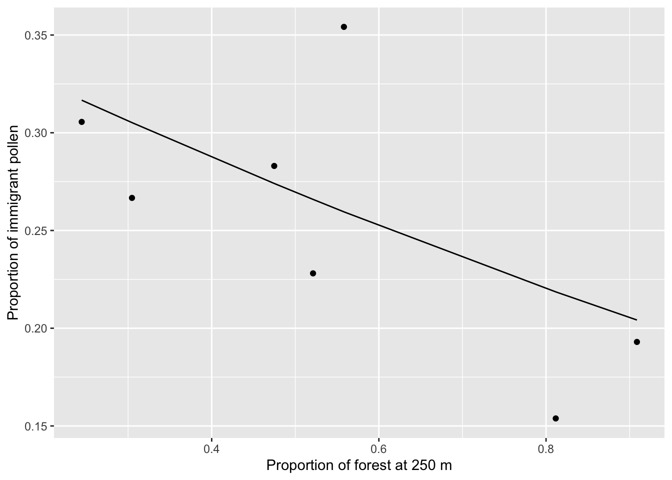 We see that populations surrounded by more forest receive less outside pollen, although it is apparent that there is one outlier (population A21) with a high proportion of immigration pollen but intermediate levels of surrounding forest. This is likely also a product of our choice of paternity anlaysis - in our original paper (DiLeo et al. in press) we were able to assign a much higher proportion of fathers in popualtion A21, giving us lower pollen immigration rates.