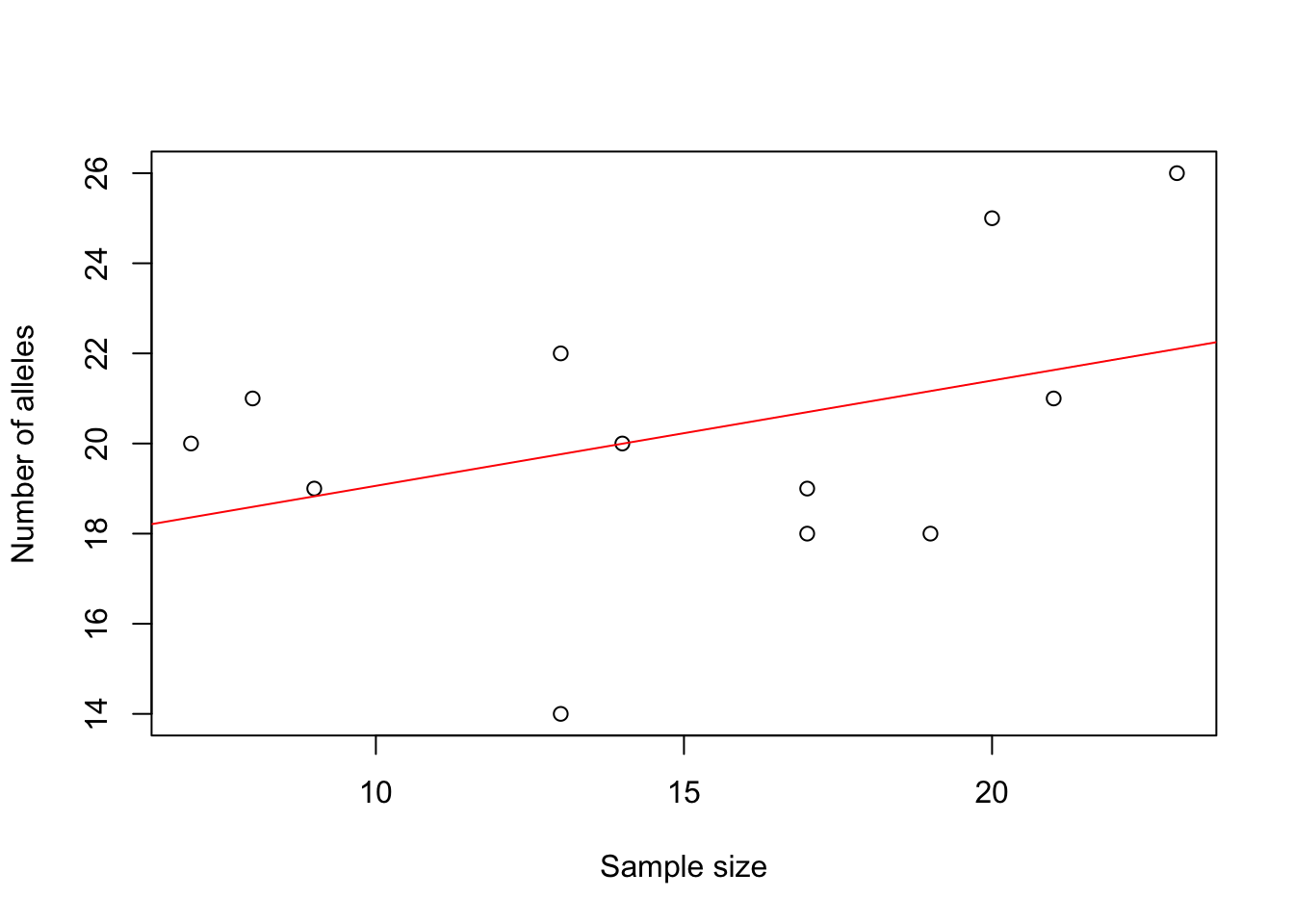 The barchart (left) shows that there is considerable variation among ponds in the number of alleles observed across all loci. The scatterplot (right) with the red regression line shows that the number of alleles increases with sample size.