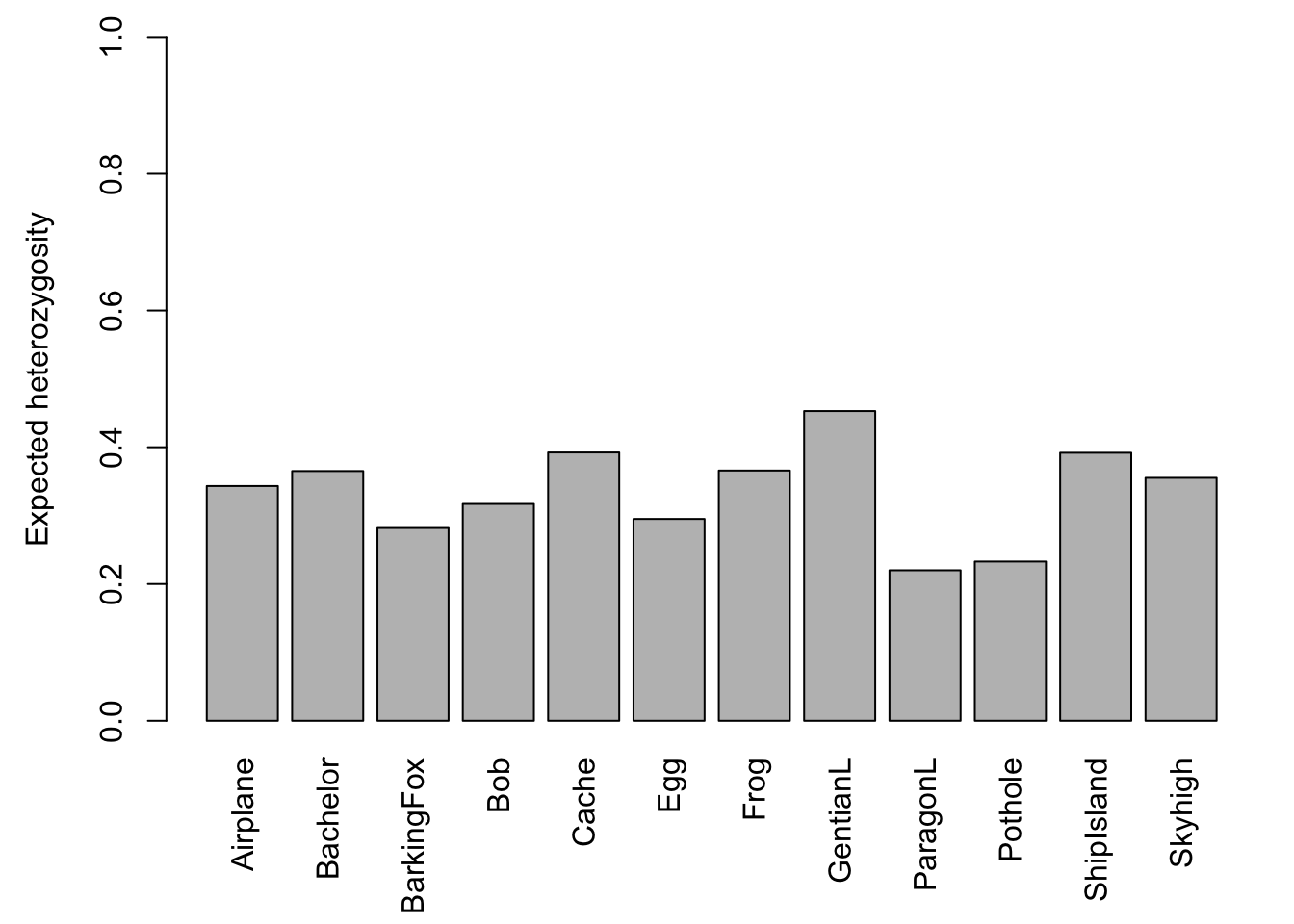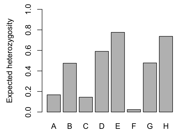 barplot(Sum$Hexp, ylim=c(0,1), ylab="Expected heterozygosity")