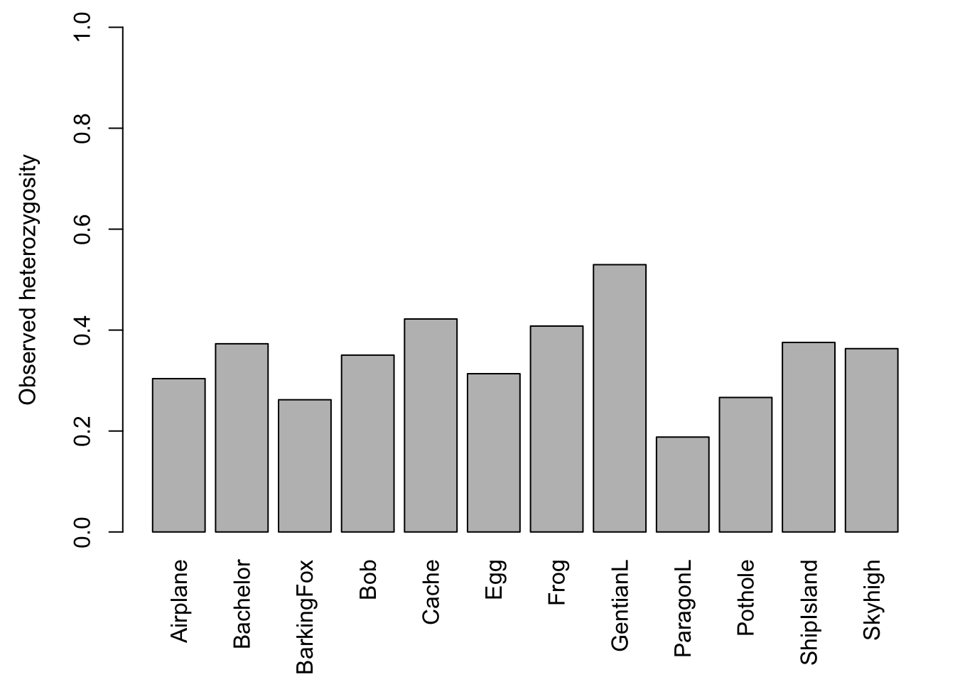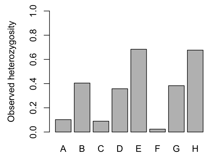 barplot(Sum$Hobs, ylim=c(0,1), ylab="Observed heterozygosity")