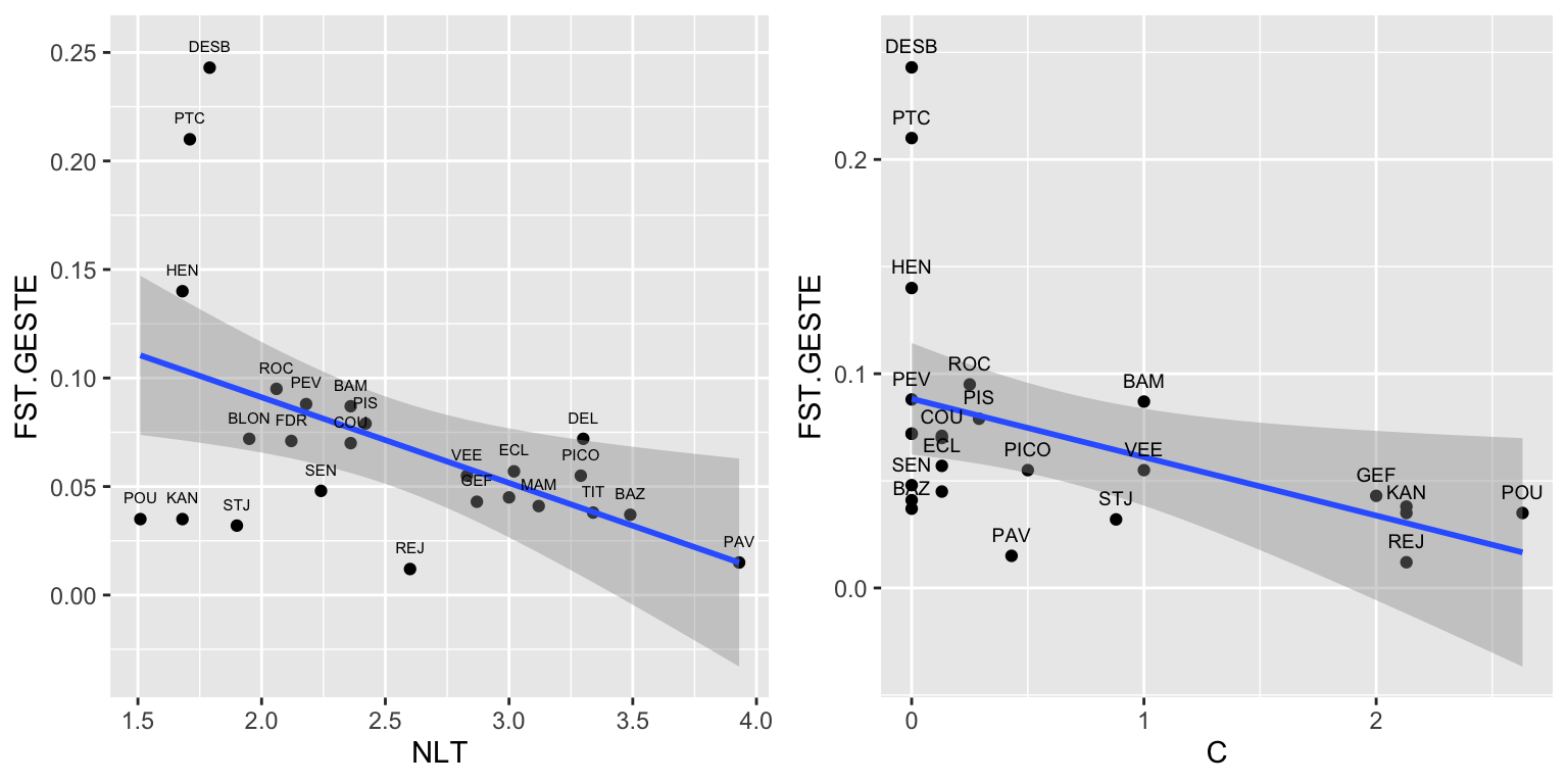 cor(dd.temporal.df[, c("Fst.temp", "APE", "NLT", "C")], use="pairwise.complete")## Fst.temp APE NLT C