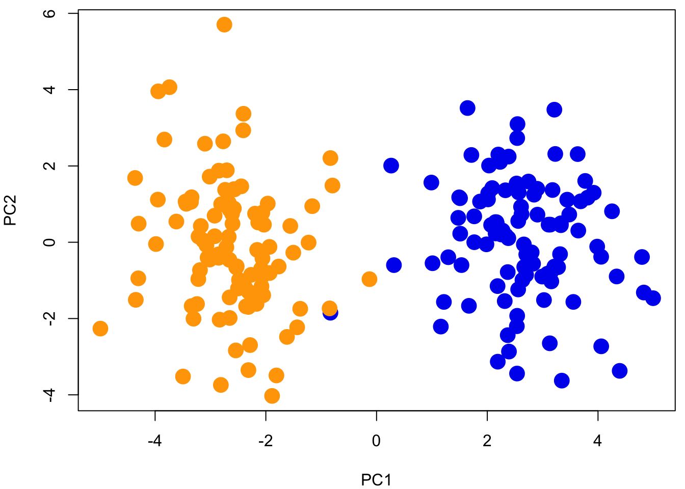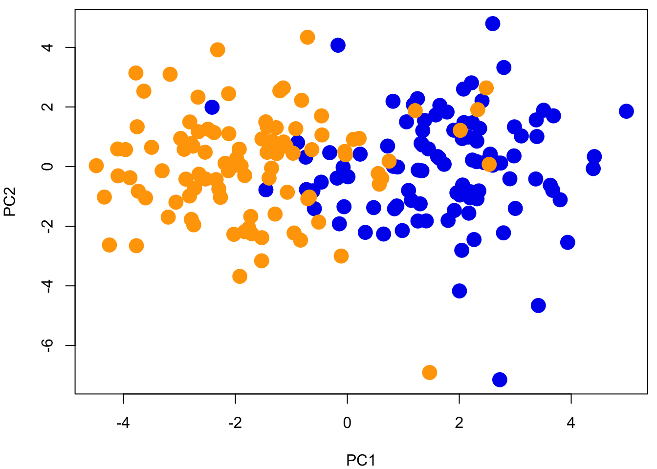 plot(pcaS$x[,1:2], col=colors[factor(sample_sites)], pch=16,cex=1.2)