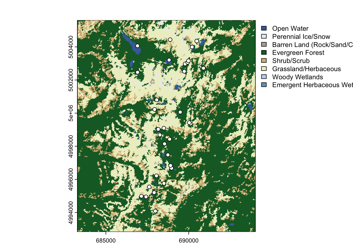 Let’s extract the categorical raster layer into a new object ‘NLCD’. We can use as.factor to tell R that this is a categorical raster layer.