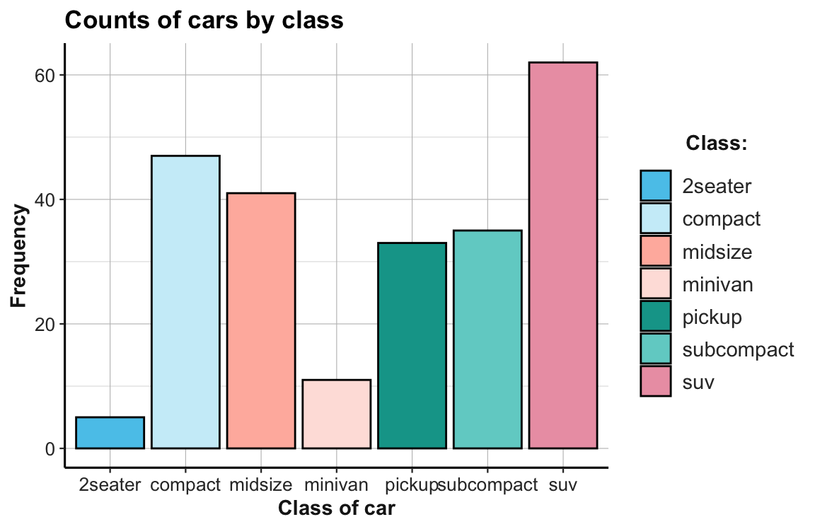 x = "Class of car", y = "Frequency", fill = "Class:") +