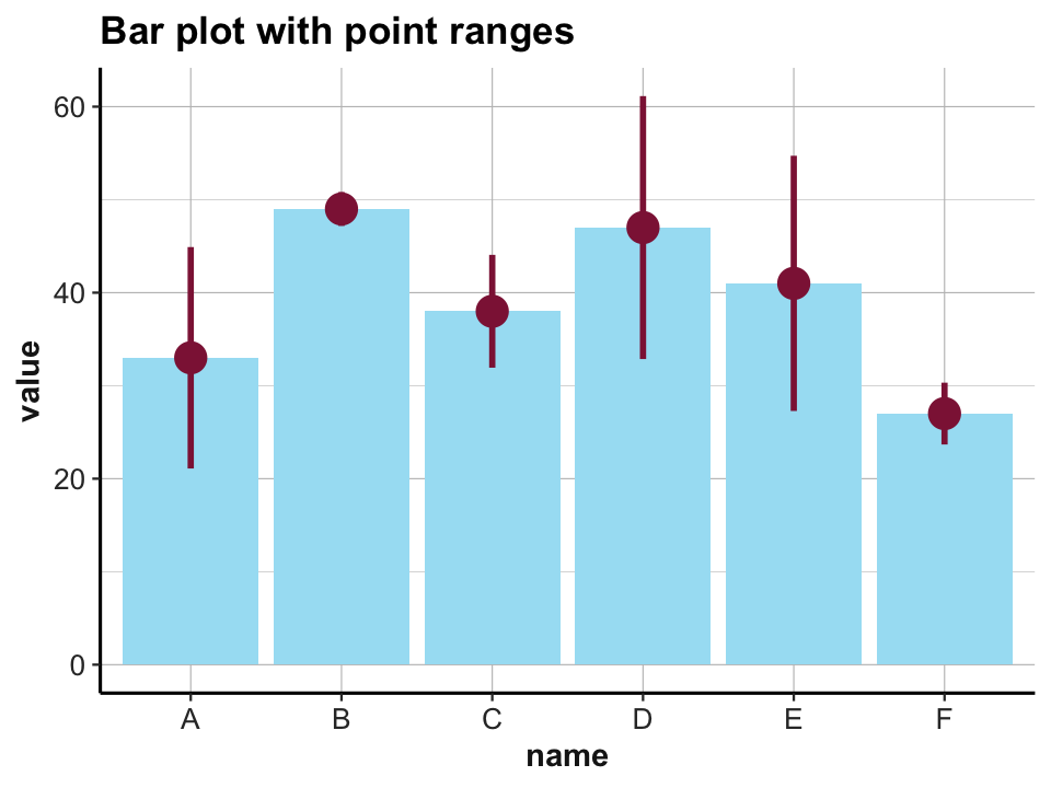 geom_pointrange(aes(x = name, y = value, ymin = value - sd, ymax = value + sd),