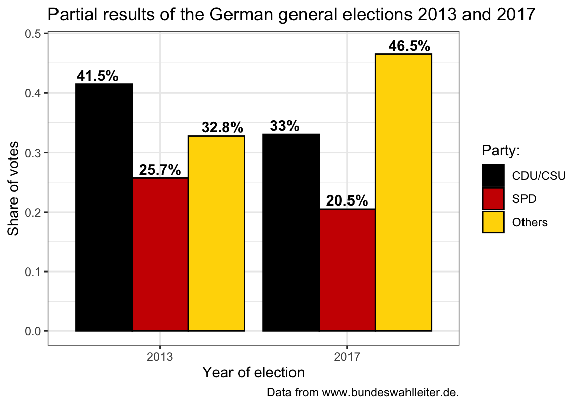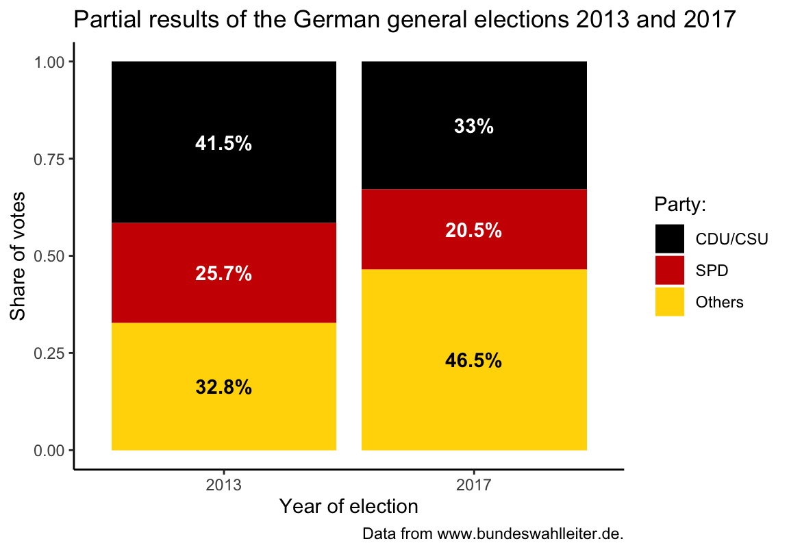 labs(title = "Partial results of the German general elections 2013 and 2017",