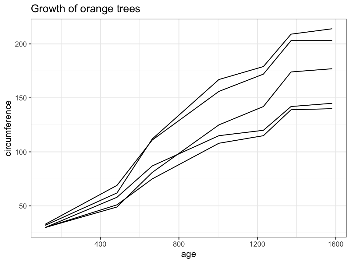 A line graph typically depicts developments of some item over time (or some other factor). To know which variable is to be plotted repeatedly, we need to specify the group property. For instance, the following plot shows the growth of orange trees by their age (using the data from datasets::Orange):